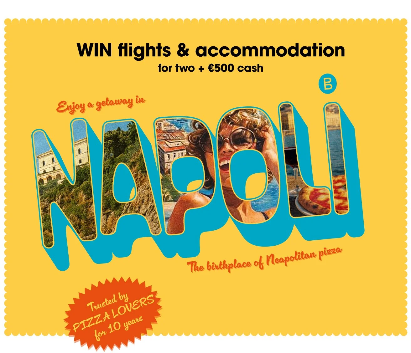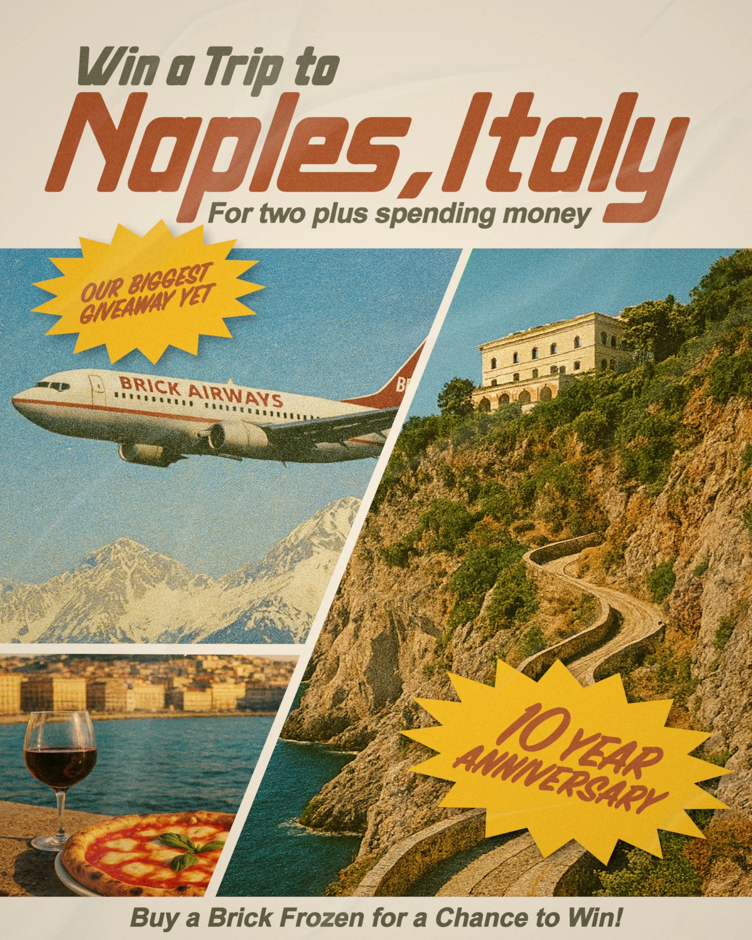 To mark our 10th anniversary, we're giving you the chance to win a trip for two to Naples - the birthplace of Neapolitan pizza - plus spending money. Simply pick up a Brick Frozen pizza from one of our 300+ nationwide stockists and enter your details below along with your batch code (the 9-digit code can be found on the reverse of our pizza packaging).